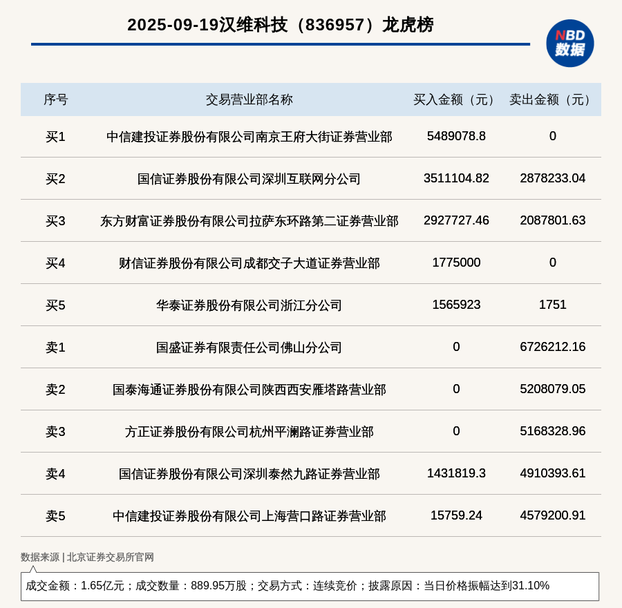 每經(jīng)訊,2025年9月19日,北交所上市公司漢維科技(836957,收盤價:17.98元)登上龍虎榜,交易方式是連續(xù)競價,披露原因是當(dāng)日價格振幅達(dá)到31.10%,成交數(shù)量889.95萬股,成交金額1.65億元。買一席位為中信建投證券股份有限公司南京王府大街證券營業(yè)部,買入548.91萬元;賣一席位為國盛證券有限責(zé)任公司佛山分公司,賣出672.62萬元。