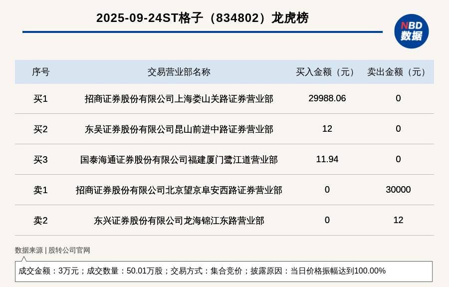 每經(jīng)訊,2025年9月24日,新三板基礎(chǔ)層公司ST格子(834802,收盤價:0.12元)登上龍虎榜,交易方式是集合競價,披露原因是當(dāng)日價格振幅達到100.00%,成交數(shù)量50.01萬股,成交金額3萬元。買一席位為招商證券股份有限公司上海婁山關(guān)路證券營業(yè)部,買入3萬元;賣一席位為招商證券股份有限公司北京望京阜安西路證券營業(yè)部,賣出3萬元。