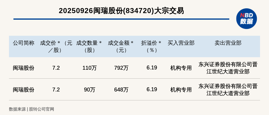 每經(jīng)訊,2025年9月26日,新三板創(chuàng)新層公司閩瑞股份(834720,收盤價:6.78元)發(fā)生2筆大宗交易,總成交金額為1440萬元,成交金額最高的一筆成交價7.2元/股,成交數(shù)量110萬股,成交金額792萬元,溢價6.19%。買入營業(yè)部是機構(gòu)專用,賣出營業(yè)部是東興證券股份有限公司晉江世紀大道營業(yè)部。