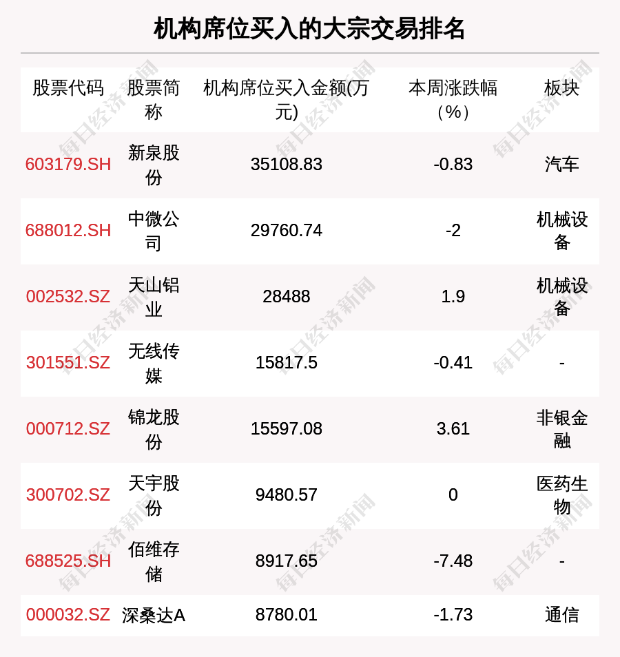 本周機(jī)構(gòu)專用席位參與了170筆大宗交易,環(huán)比上周增加80筆。本周機(jī)構(gòu)席位買入金額前3的公司為新泉股份、中微公司、天山鋁業(yè),機(jī)構(gòu)買入金額分別為3.51億元、2.98億元、2.85億元。