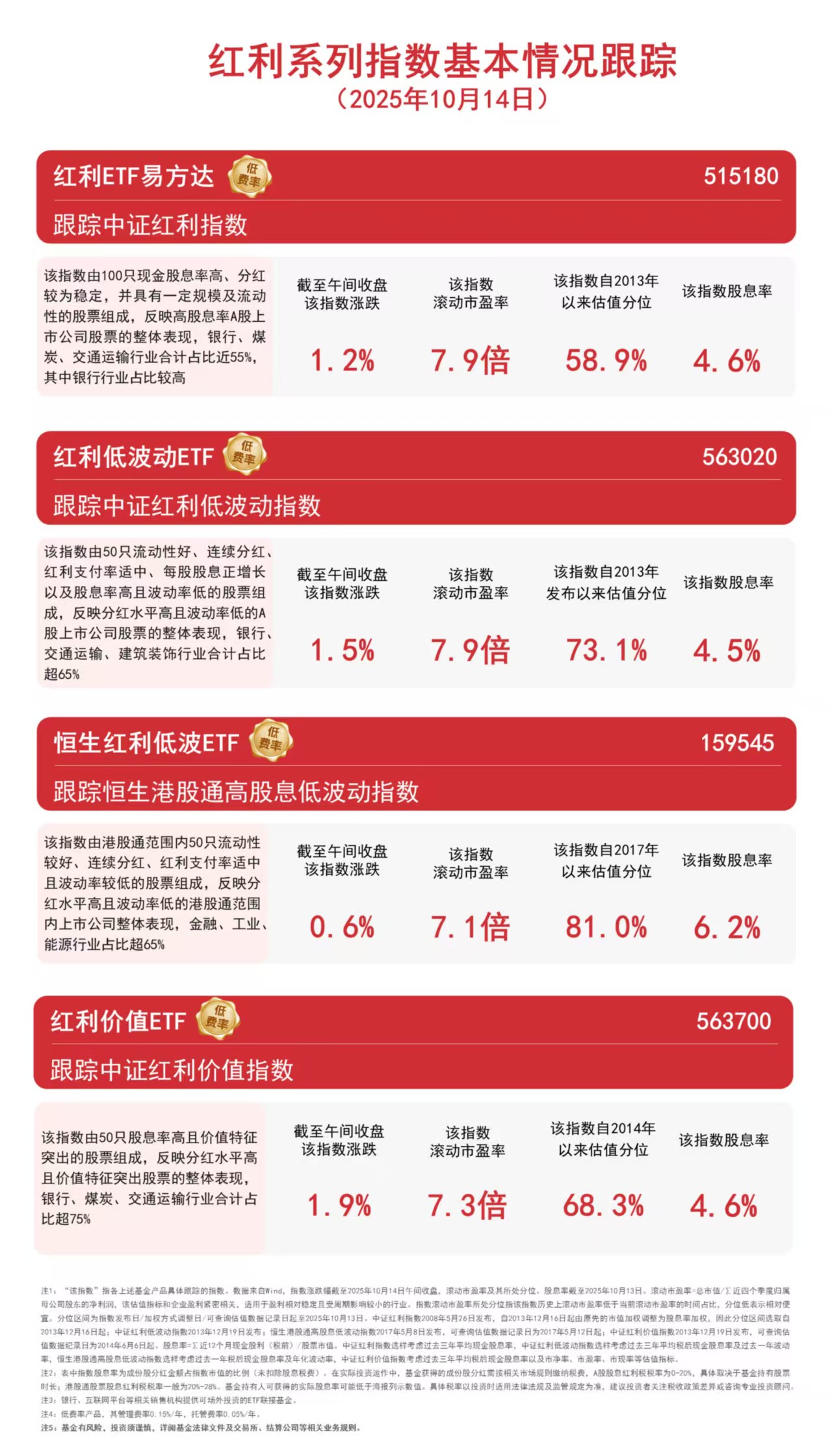 紅利板塊早盤延續(xù)漲勢,截至午間收盤,中證紅利價值指數(shù)上漲1.9%,中證紅利低波動指數(shù)上漲1.5%,中證紅利指數(shù)上漲1.2%,恒生港股通高股息低波動指數(shù)上漲0.6%。紅利板塊表現(xiàn)亮眼,相關產(chǎn)品受關注。Wind數(shù)據(jù)顯示,截至昨日,紅利ETF易方達(515180)和紅利低波動ETF(563020)近5個交易日分別獲3.3億元和1.1億元資金凈流入。