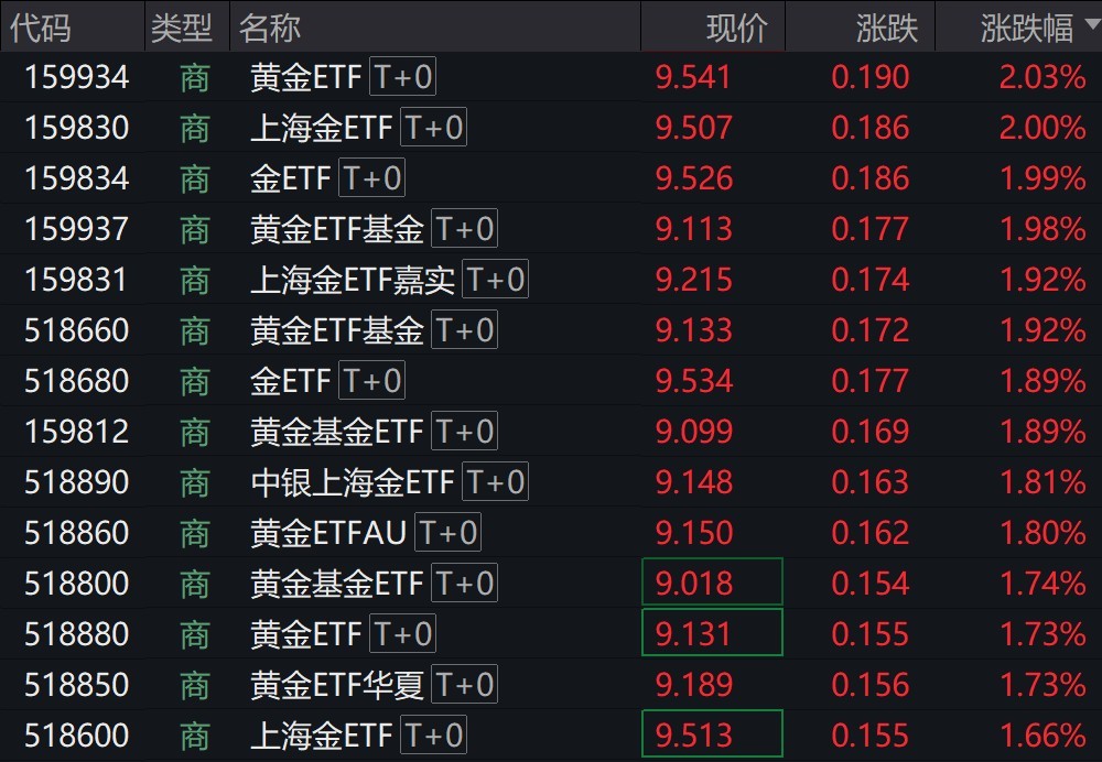 受盤面影響,商品黃金相關(guān)ETF早盤漲約2%。