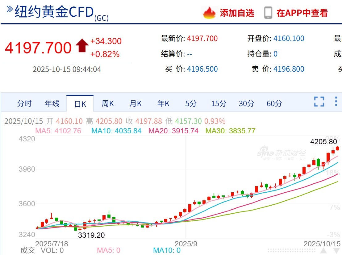 10月15日,紐約期金突破4200美元/盎司關(guān)口,再創(chuàng)歷史新高。