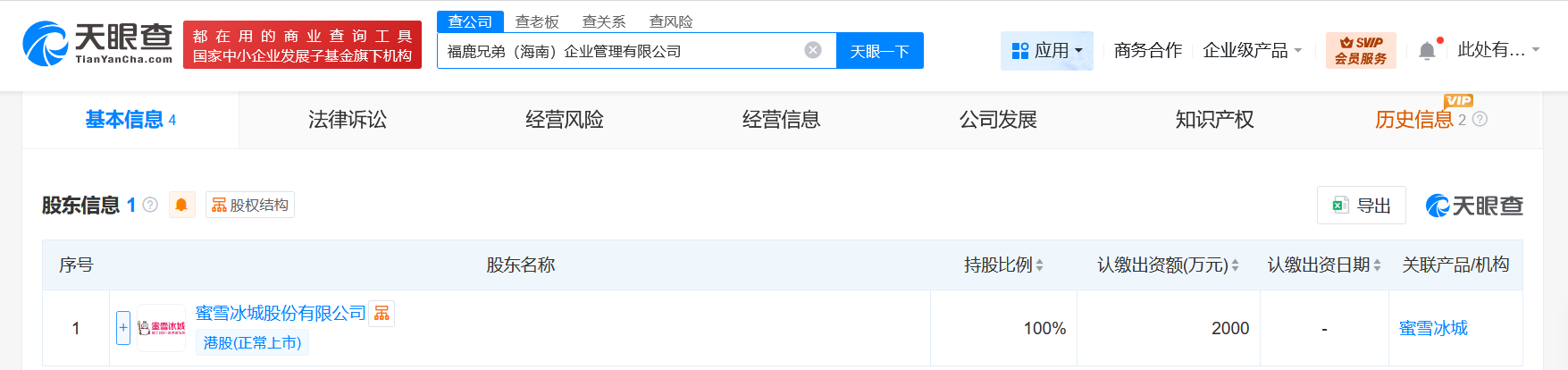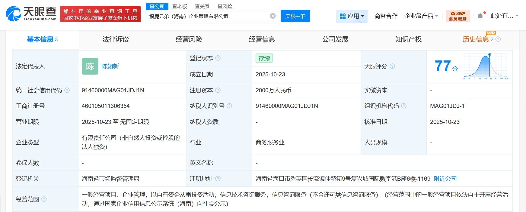 每經AI快訊,天眼查工商信息顯示,近日,福鹿兄弟(海南)企業(yè)管理有限公司成立,法定代表人為陳翊新,注冊資本2000萬元人民幣,經營范圍為企業(yè)管理、以自有資金從事投資活動、信息技術咨詢服務、信息咨詢服務。股東信息顯示,該公司由蜜雪冰城股份有限公司全資持股。