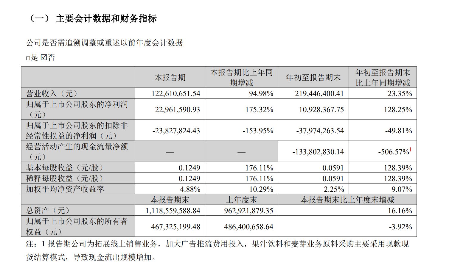 對(duì)于營(yíng)業(yè)收入的增加,公司稱,主要由于公司積極拓展抖音等線上銷售渠道,銷售收入同比增加3934萬(wàn)元;同時(shí),新收購(gòu)的果汁飲料業(yè)務(wù)自并表日起實(shí)現(xiàn)收入1730萬(wàn)元。