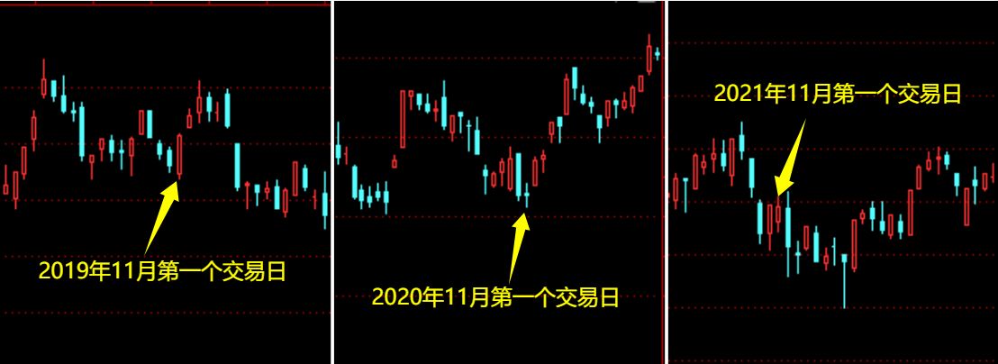 比如,2019年11月的前3個交易日,大盤連續(xù)上漲;2020年11月第一個交易日探底之后,大盤連續(xù)反彈了6個交易日;2021年11月的前8個交易日大盤震蕩,跌幅僅只有1.55%;2022年10月31日探底成功之后,進(jìn)入11月就開啟了一波幅度較大的反彈行情;2023年11月,大盤向上震蕩反彈了15個交易日;2024年11月,大盤反彈了6個交易日。