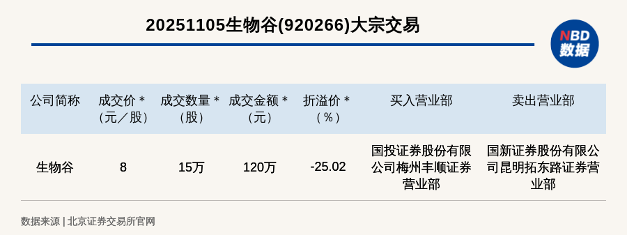 每經(jīng)訊,2025年11月5日,北交所上市公司生物谷(920266,收盤(pán)價(jià):10.67元)發(fā)生一筆大宗交易,成交價(jià)8元/股,成交數(shù)量15萬(wàn)股,成交金額120萬(wàn)元,折價(jià)25.02%。買入營(yíng)業(yè)部是國(guó)投證券股份有限公司梅州豐順證券營(yíng)業(yè)部,賣出營(yíng)業(yè)部是國(guó)新證券股份有限公司昆明拓東路證券營(yíng)業(yè)部。